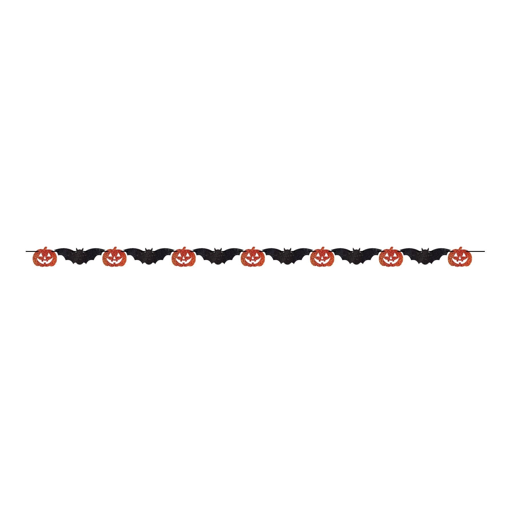 "Add a spooky touch to your Halloween decor with this Pumpkin & Bat Streamer! Glitter print, 4" x 7", assembly required. 1/package, 12 packages per case."