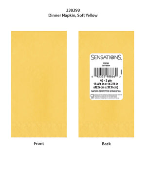 Create a classic and elegant table setting with the Soft Yellow 2Ply Dinner Napkins. Each package contains 40 napkins, 10 packages per case for a total of 400. These napkins are made in the USA and feature a soft yellow color that is perfect for any party or special event. The 2-ply construction ensures that the napkins are both durable and absorbent, perfect for wiping away messes. They're also disposable for easy clean-up. Add a touch of sophistication to your table setting with Soft Yellow 2Ply Dinner Napkins.