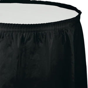 This Black Velvet Plastic Tableskirt is perfect for adding a touch of class to any event. The 14' x 29" tableskirt is made of mediumweight plastic and features a pleated top edge and classic drape. The midnight black shade will match perfectly with the coordinating Black Velvet tablecover and solid color party supplies. The tableskirt wraps around a 14' perimeter of any shape banquet table, providing a tidy look that is perfect for hosting black tie weddings, company parties, family reunions and more. With one tableskirt per package, you can get the perfect look for your event.