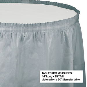 Our Shimmering Silver Plastic Tableskirt is the perfect way to add a touch of elegance to your event. This 14' x 29" tableskirt is made of mediumweight plastic and is ideal for silver anniversaries, school dances, receptions, and milestone birthdays. It can accommodate 6 to 8 foot banquet tables as well as smaller rounds. Plus, you don't have to worry about rental fees or stains. Simply dispose of the tableskirt at the end of the event. Get one Shimmering Silver Plastic Tableskirt for a discount price and enjoy the formal dimension it provides. Shop Our for all your solid color party tableware and accessories needs.