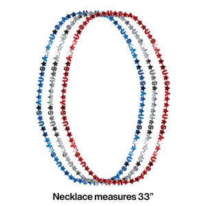 Show your American pride with this stylish Patriotic Letter Necklace. This package of 3 necklaces features a unique design of red, white, and blue beads with stars and "USA" lettering. Each necklace is 33" long and made of durable plastic. Perfect for 4th of July and patriotic-themed parties, these necklaces coordinate great with other USA party supplies. Get creative and use them as decorations or give them away as party favors. With discount pricing, these USA Necklaces are perfect for event planners, caterers, and home hostesses alike. Show your patriotism with this Patriotic Letter Necklace!