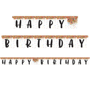 This Confetti Sprinkles Jointed Banner Lg is the perfect way to add a festive touch to any kids birthday party. Measuring 7" x 120", this banner is made of mediumweight paperboard and features black lettering that spells out "Happy Birthday". Easily hung around the party scene, this banner can be coordinated with other Confetti Sprinkles party supplies for a complete look. Perfect for event planners, caterers, and home hostesses alike, this banner is sure to make any kids birthday party a hit! Coordinating solid color tableware is available in Classic Red and Bermuda Blue. Get the party started in style with this Confetti Sprinkles Jointed Banner Lg!