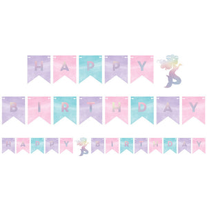Bring a sparkle to the party with the Iridescent Mermaid Party Happy Birthday Banner! This colorful banner features a twine string with 12 flags in purple, pink and teal. Each flag is decorated with a letter spelling out "Happy Birthday" along with an iridescent mermaid cutout. Measuring 6" x 64.5", this banner is perfect for any kids birthday party and can be coordinated with other Iridescent Mermaid Party supplies. With 12 banners in a case, you can get great discount pricing for bulk quantities. Make your kid's birthday party extra special with the Iridescent Mermaid Party Happy Birthday Banner!