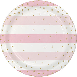 Celebrate your little one's birthday in style with our Pink and Gold Celebration Dinner Plates. These 8.75" heavyweight paperboard plates feature a pink, white, and gold theme and come in packs of 8, with 12 packages per case for a total of 96 plates. Perfect for any party planner, catering service or home party planner, these disposable plates coordinate with all Pink and Gold Celebration party supplies. With our discount pricing on bulk quantities, you can make your little one's birthday party a dream come true.