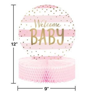 Welcome your new bundle of joy in style with our Pink and Gold Celebration Baby Shower Centerpieces. These elegant centerpieces feature a pink and gold design with the phrase "Welcome Baby" prominently displayed in the middle. Perfect for any baby shower or birthday party, these centerpieces measure 9" x 12" and come in a convenient 6 ct package. This makes them perfect for catering services, party planners, or home party planners who need to buy in bulk. Add the finishing touch to your special day with our Pink and Gold Celebration Baby Shower Centerpieces.