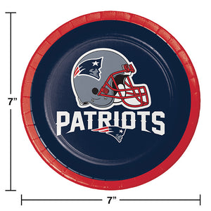 Show your support for the New England Patriots with these officially licensed dessert plates! Perfect for tailgating parties, game day gatherings, or sports-themed establishments, these deep blue plates feature an image of the silver Pats helmet in the center with the team name printed in white underneath. A bright red border rims the cake plates, which are the perfect size for appetizers, sides, salads, and desserts. Made of heavyweight paperboard, these plates measure 6.875" in diameter and come in packages of 8. Celebrate your favorite NFL team with these New England Patriots Dessert Plates!