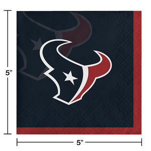 Show your Houston Texans pride with these 16 count Beverage Napkins! Perfect for any football party or tailgate, these napkins feature the classic red and blue colors. Made of 2-ply tissue, they measure 5 Inches x 5 Inches. Coordinate with our larger selection of Houston Texans party supplies to wow your guests. Stock up on NFL party supplies and show your team spirit with these Houston Texans Beverage Napkins!