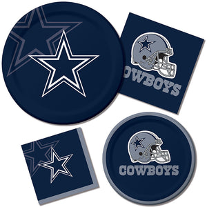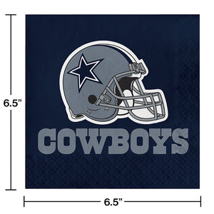 Show your team spirit with these officially licensed Dallas Cowboys Napkins! This package of 16 two-ply tissue napkins feature a festive silver border on two sides, a blue background with the team's star logo in white, and a quarter fold design. Perfect for individual place settings, buffet tables, and tailgating celebrations, these napkins measure 6.5 Inches x 6.5 Inches and are sold in retail-ready packaging. Make your next party or event a hit with these Dallas Cowboys Napkins!